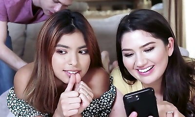 Bitchy hotties Kara and Alexandra Silk suck elder man's cock