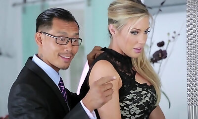 chinesische av-modell im büroanzug bekommt super-freche gruppe pummel